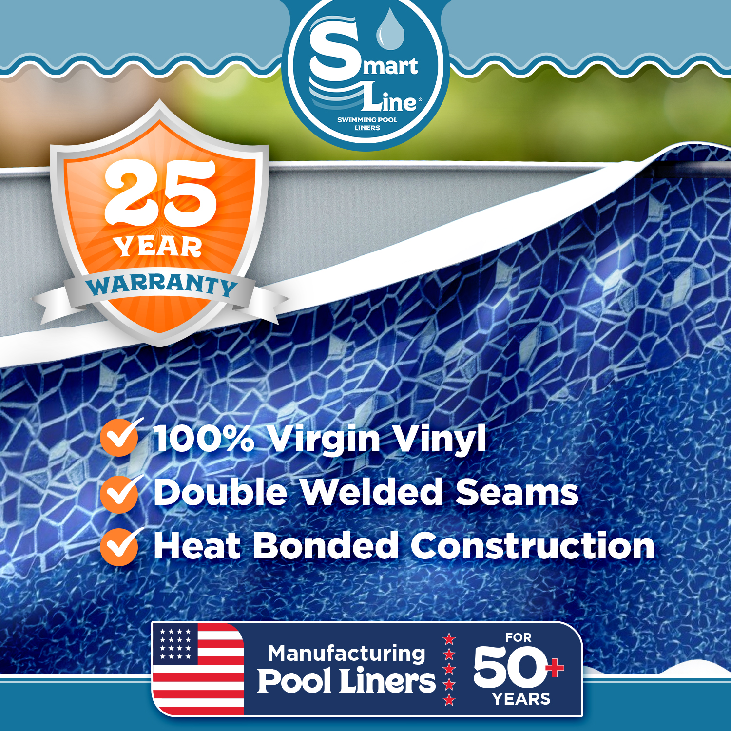 The SmartLine® Cracked Glass pool liner provides a beautiful mosaic of blue glass pieces arranged around the top of your swimming pool.